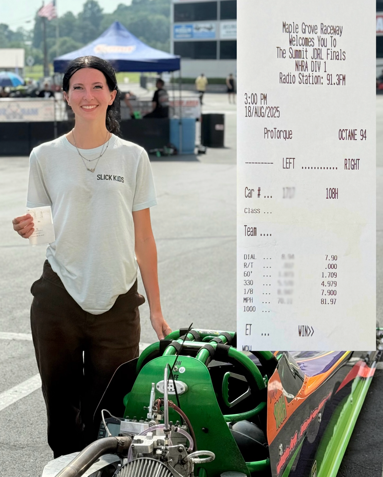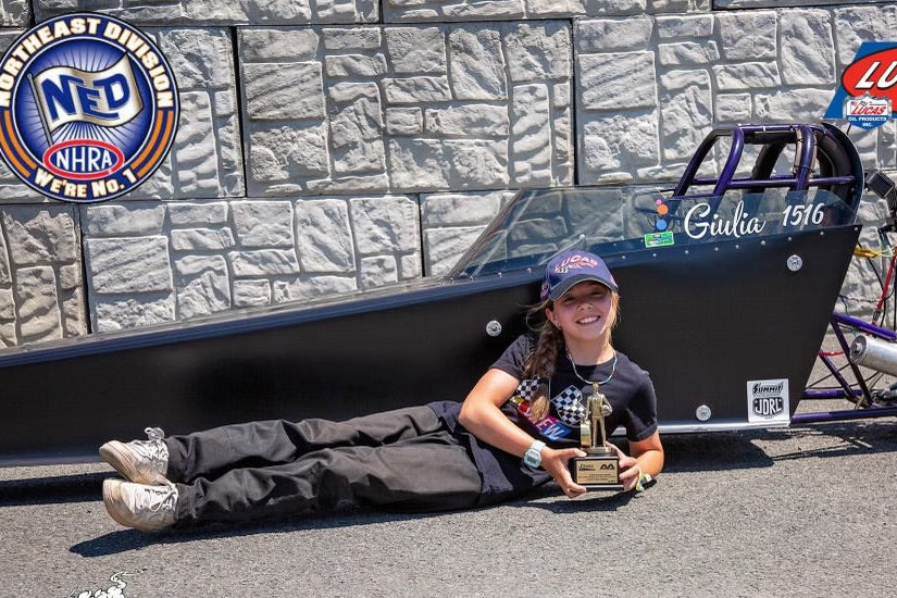 In a short time, Giulia has already built an impressive resume. She earned her first Wally at an NHRA Divisional race at Lebanon Valley, picked up a win and runner-up finish at EPCAL Jr. Dragster events, and finished 1st in points in the AA Auto Salvage and Craws Racing NHRA Series for the 6–10 age group. Her success led to an invitation to the 2025 NHRA Nationals at Maple Grove, where she raced alongside some of her idols.