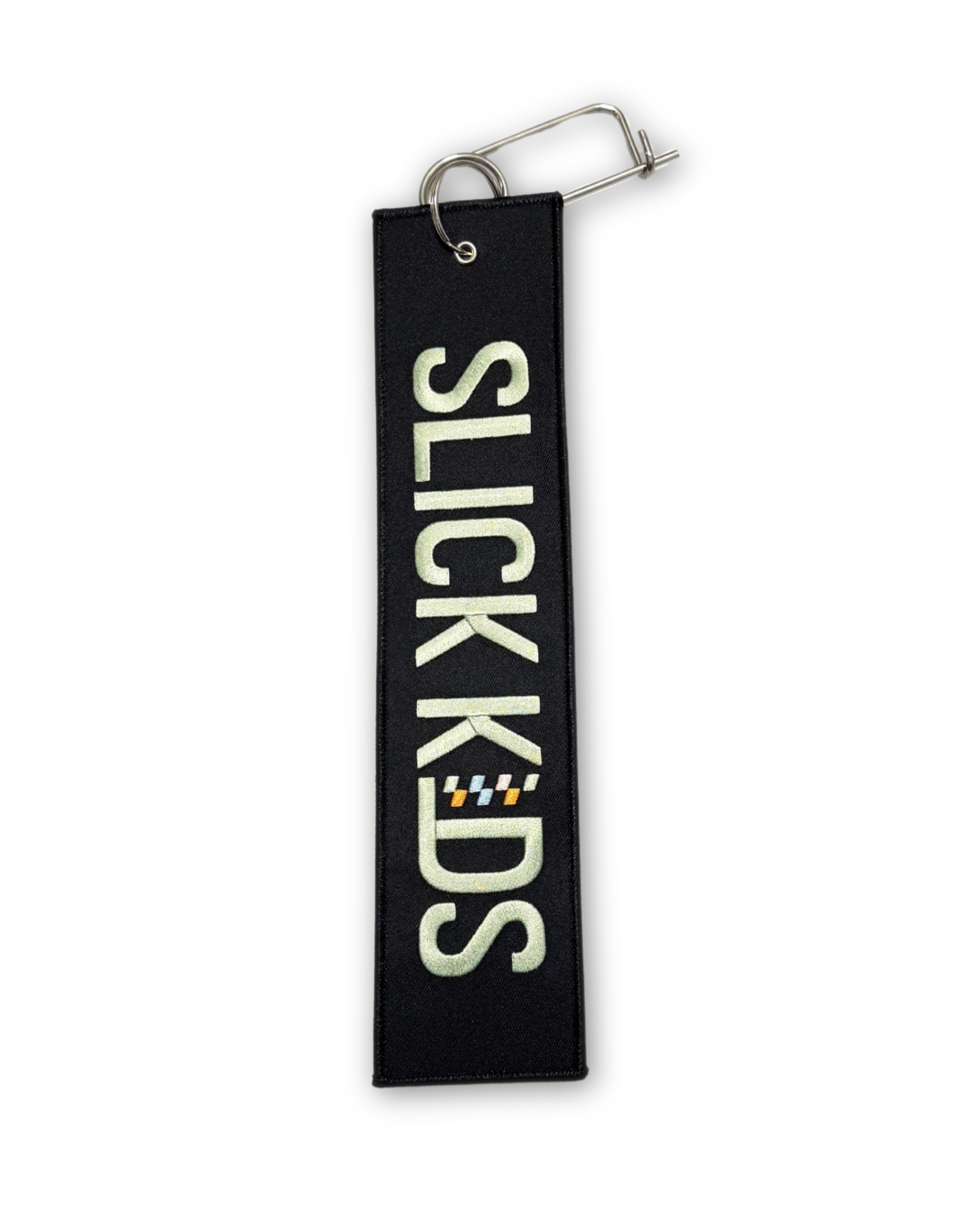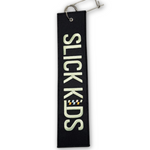 The Slick Kids Parachute Tag features our signature embroidered logo in green with a checkered detail, stitched on a heavy-duty black backing. Designed with racers in mind, it’s the perfect trackside add-on for your chute, key ring, or race bag.